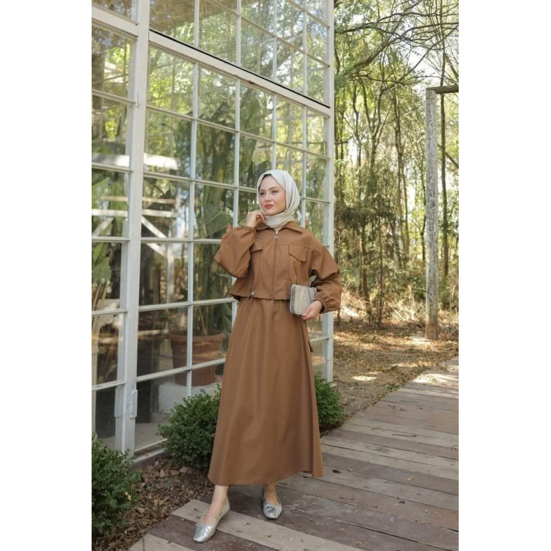 القطعة السفلية/الداخلية: فستان طويل أو عباية واسعة بأسلوب A-line أو Flared، مزودة بأزرار أمامية وحزام عند الخصر، مع قطعة علوية بياقة عالية للحتشام.