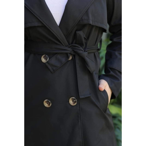 A classic trench coat that embodies practical elegance with its flowing silhouette and refined tailoring. It features wide lapels, double-breasted front buttons for a polished look, and a fabric belt that cinches the waist for a feminine shape. Epaulettes on the shoulders add a subtle military-inspired touch. Made from weather-resistant materials like treated cotton or gabardine, it’s perfect for fall and winter seasons.