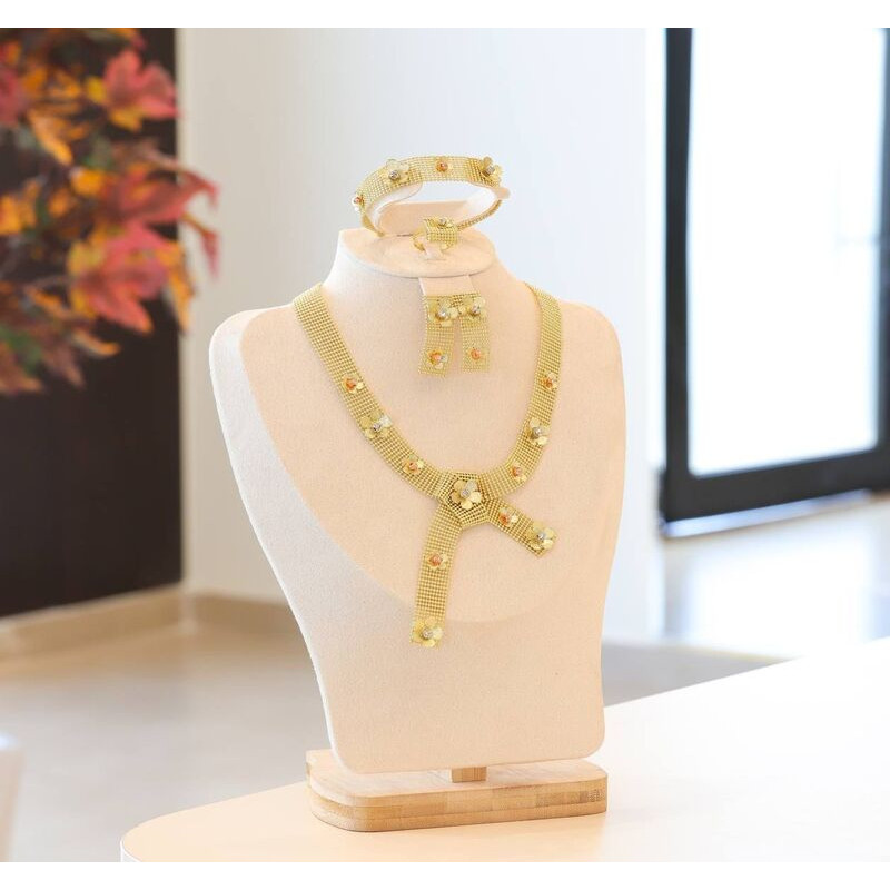 A golden rose design set that is distinguished by its romantic appeal inspired by the beauty of nature, as the details of the roses are embodied with extreme precision, giving it a soft feminine character and a quiet luxury that is not devoid of distinction