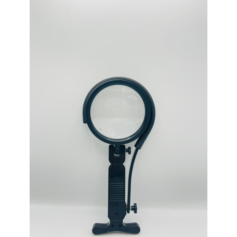 A magnifying glass with a stand and base, designed for desk or tabletop use, combining clarity and flexibility. The magnifying lens is large and circular, surrounded by a dark frame for clear viewing of small objects, while the articulating arm allows free adjustment of the lens position and height to suit various needs. The wide, flat base provides strong stability on any surface, and the construction appears to be sturdy dark-colored plastic, ensuring durability. This magnifier is ideal for tasks that require precision, such as reading, crafts, electronics repair, or any activity needing clear visual magnification.