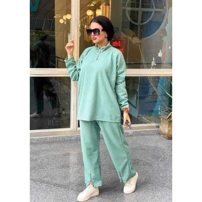 A chic and cozy matching women’s knitwear set featuring a ribbed oversized sweater with puff sleeves